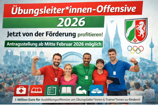 Das Land Nordrhein-Westfalen startet im Jahr 2026 eine Übungsleiter*innen-Offensive, um die Ausbildung von Übungsleiter*innen, Trainer*innen, Sporthelfer*innen sowie weiterem qualifizierten Anleitungspersonal im organisierten Sport zu fördern. Insgesamt stehen Haushaltsmittel in Höhe von 1 Mio. Euro zur Verfügung.