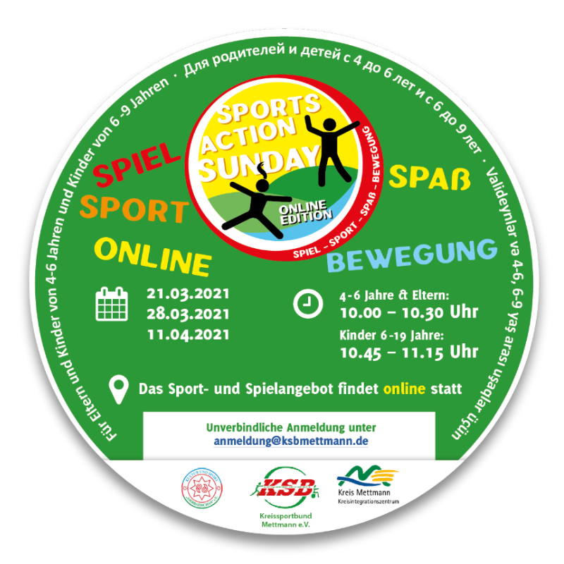 Am 21.03. , 28.03. und 11.04.2021 findet die online-Edition der SPORTS-ACTION-SUNDAYS statt. Der Verein „Kultur und Sport Aserbaidschan e.V.“ bietet in Kooperation mit dem Kreissportbund Mettmann e.V. und dem Kreisintegrationszentrum ein kostenloses Spiel- und Bewegungsprogramm an.
