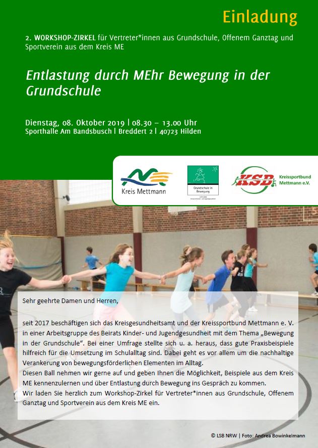 Dieser Ball wurde aufgenommen und in Form eines Workshop-Zirkels ins Spiel gebracht. Der Workshop-Zirkel soll jährlich stattfinden und dazu dienen, „gute Beispiele“ aus dem Kreis ME kennen zu lernen und über Entlastung durch Bewegung ins Gespräch zu kommen. Die Teilnehmer*innen des Workshop-Zirkels sind Grundschullehrer*innen, pädagogische Mitarbeiter*innen im Offenen Ganztag und Vertreter*innen der Sportvereine aus dem Kreis Mettmann.